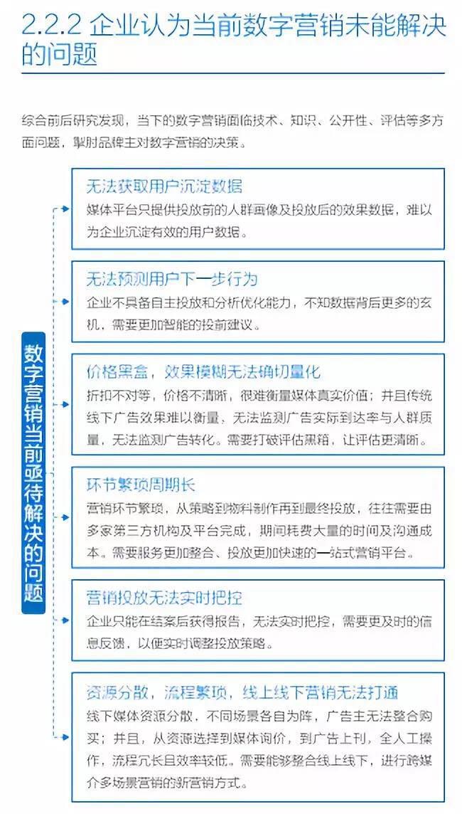 根據《白皮書》針對國内300位數字營銷決策者調查顯示,近7成廣告主已經在不同的程度上採用瞭(le)數字營銷方式,在數字營銷上的投入也在逐年增加,需求也在多樣化,這說明廣告主已經充分意識到數字營銷的重要性並(bìng)試圖更好地使用數字營銷的解決方案。但是,現實是推廣轉化率低、成本高、沒有更智能的解決方案等問題,導緻瞭(le)廣告主無法獲取用戶沉澱數據、無法預測用戶下一步行爲、效果模糊無法確切量化、線上線下無法打通等等諸多當前無法解決的問題。