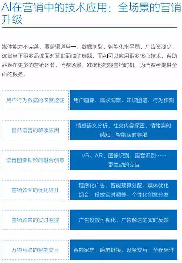 但是如同空氣和水一般存在的AI並(bìng)不代表所有營銷人都能夠像呼吸和喝水一般自然而順暢(chàng)地使用AI營銷,AI的核心技術是機器學習、神經網絡、深度學習和專家系統,而隻有當AI與營銷應用各個環節深度融合,才能真正讓AI爲營銷創造價值。